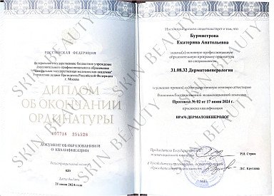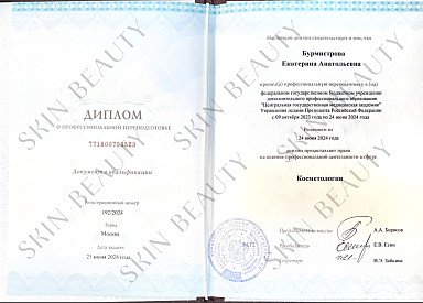 2024 гг. - Федеральное Государственное Бюджетное Учреждение Дополнительного Профессионального Образования "Центральная Государственная Медицинская Академия" Управления Делами Президента Российской Федерации, специальность «Косметология» - врач-косметолог
